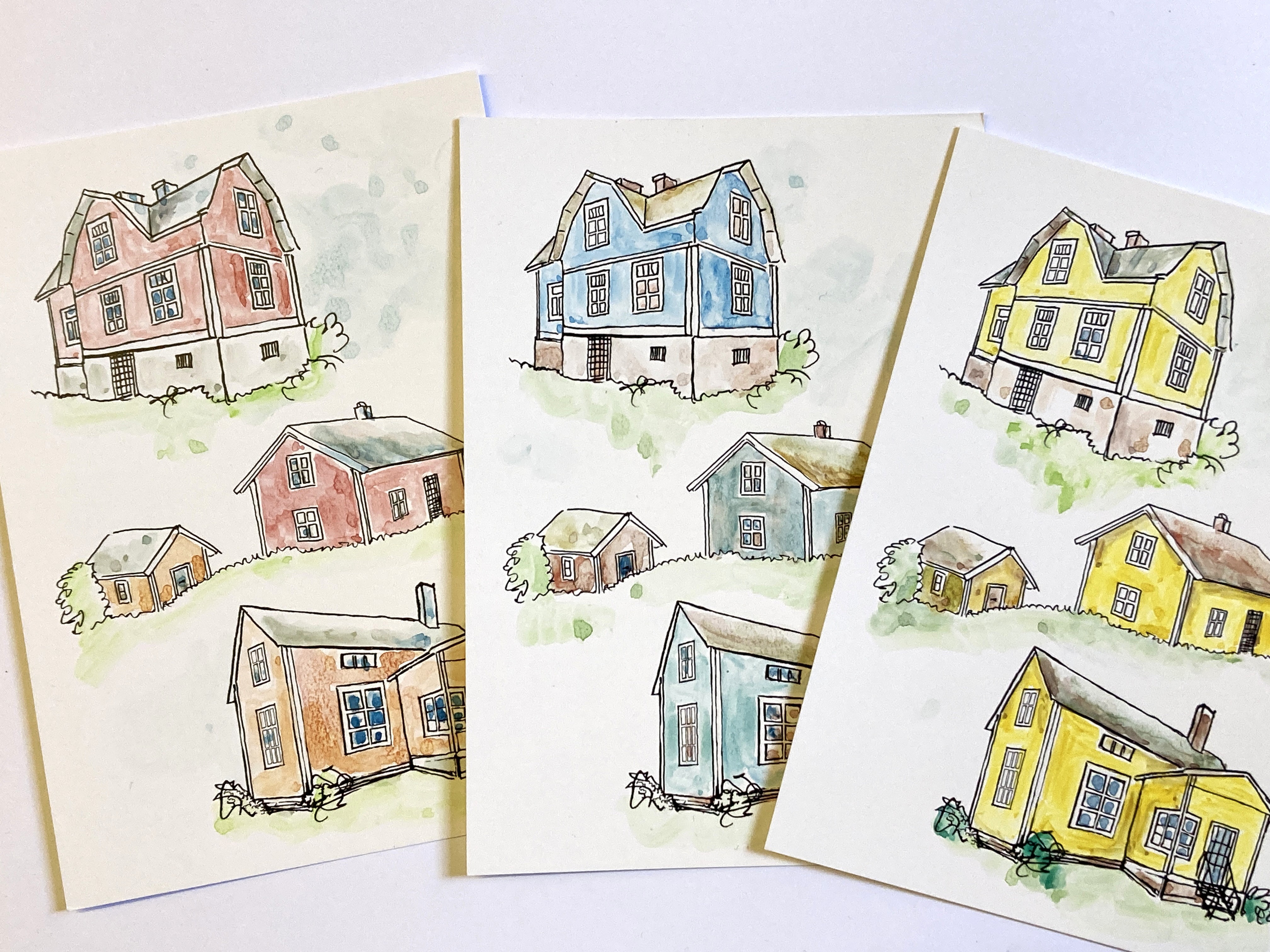 Vesiväreillä talot voi värittää hyvin yksityiskohtaisesti ja kuitenkin elävästi. Mikäli haluat säilyttää tarkat värirajat, malta odottaa tarpeeksi kauan, että väri kuivuu ennen viereisen värin lisäämistä. Toisaalta vesivärein voit heittäytyä leikittelemään kunnolla, unohtaa kokonaan ääriviivat ja käyttää värittämisessä isoja värialueita.