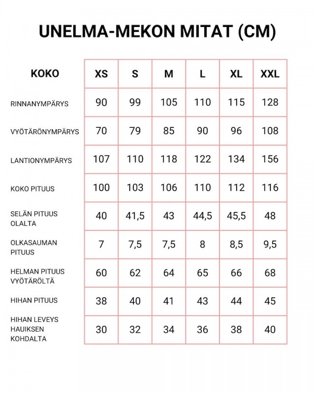 Mekkojen mitat -taulukon mitat ovat noin mittoja. Jos sinulla on kysyttävää, ota yhteyttä tyyki@tyyki.fi tai 040 727 4948. Toimitusaika 1-2 viikkoa mikäli tuotetta ei ole valmiina. Ilmainen postitus Suomeen.