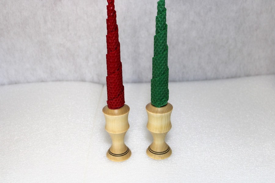 Koivuiset kynttilänjalat pitkillä mehiläisvahakynttilöillä. Saatavilla kahta väriä: Joulunvihreä tai punainen.