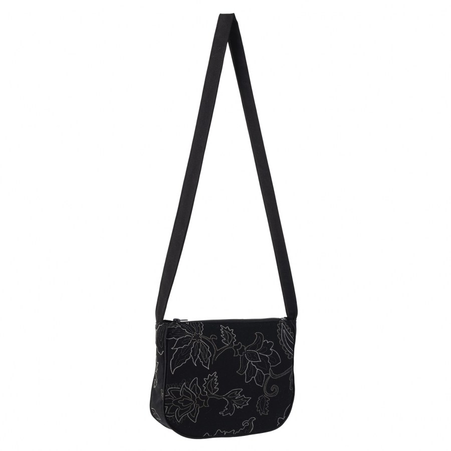 Keskikokoinen musta/valkoiset kukat kierrätyskankaasta valmistettu pitkähihnainen laukku.