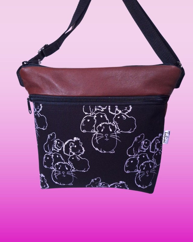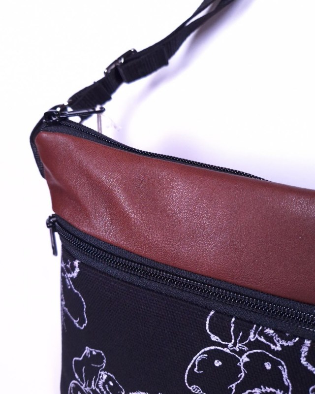 Laukun paksuun mustaan puuvillaiseen sivutaskuun on käsin painettu kuvio kankaanpainoväreillä.