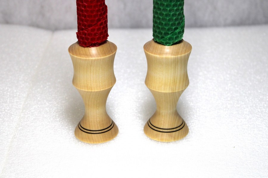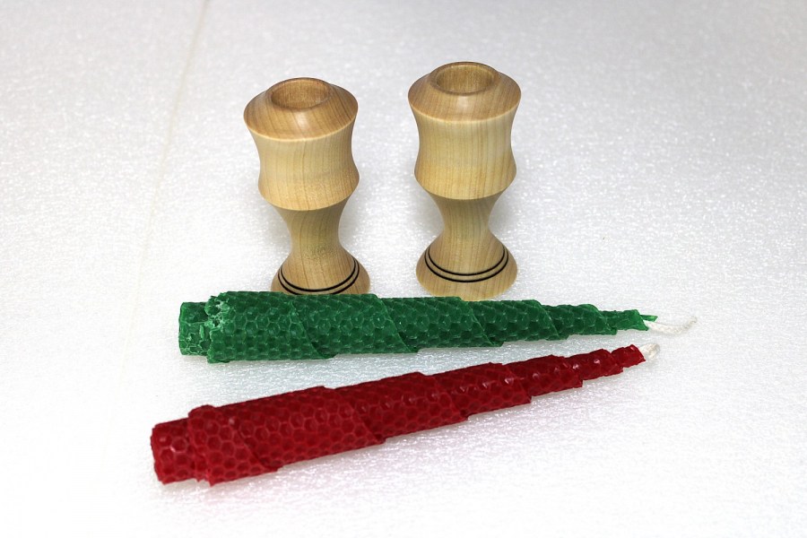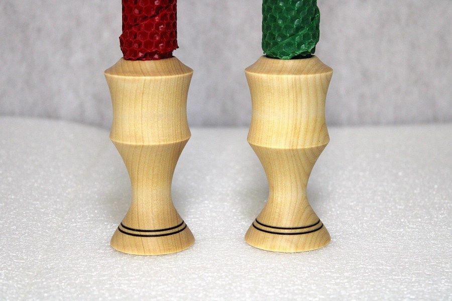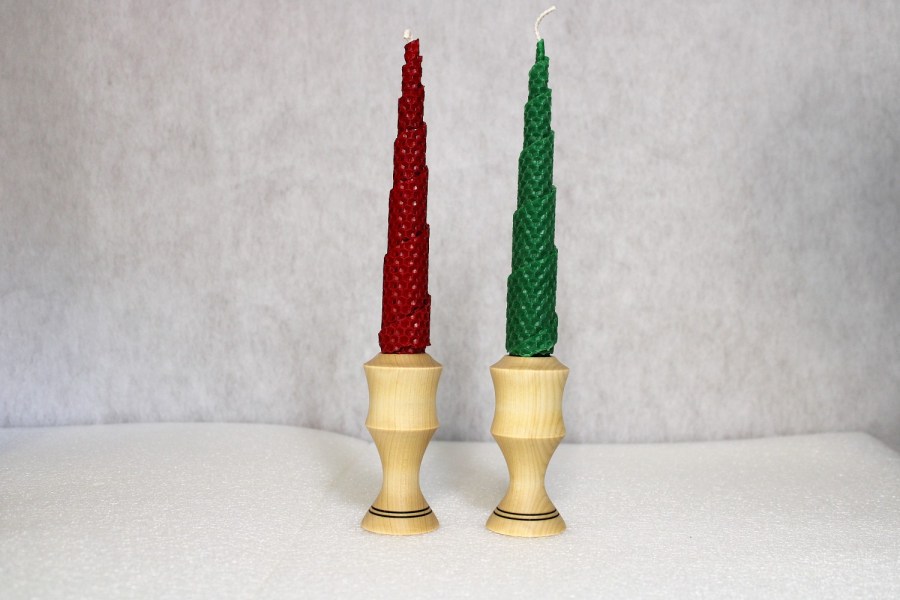 Koivuiset kynttilänjalat pitkillä mehiläisvahakynttilöillä. Saatavilla kahta väriä: Joulunvihreä tai punainen.