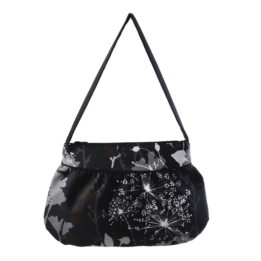 Musta pohjaväri/ vaaleat kuviot kierrätyskankaasta valmistettu laukku.