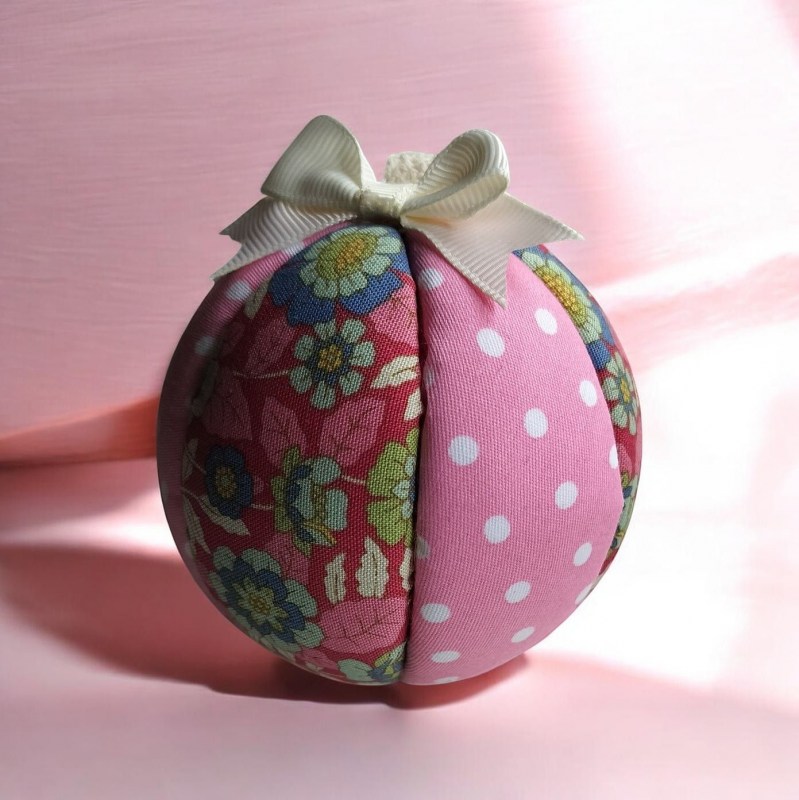 Pallon pohjana käytetty halkaisijaltaan 8 cm styroxpalloa, joka on päällystetty kauniilla kuvioiduilla puuvillakankailla.